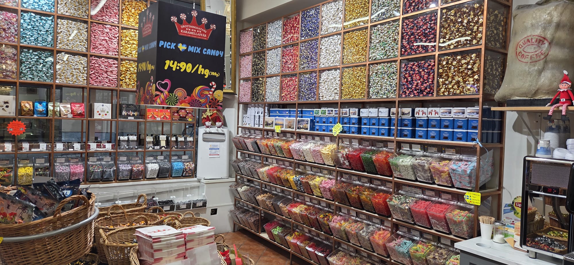 Vi är en liten godisbutik och ett café på Drottninggatan i Stockholm. Här hittar du svenska klassiker som polkagrisar, choklad från Marabou och en färgglad vägg med lösviktsgodis – tillsammans med nygräddade våfflor och crêpes. Planerar du ett besök? Kolla våra öppettider, se hur du hittar hit eller bläddra i vårt sortiment.